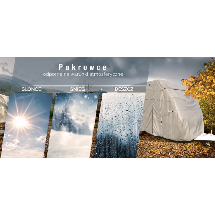 Zastosowanie 4-warstwowego, wodoodpornego materiału zapewnia skuteczną barierę przed deszczem, promieniami UV, kurzem, śniegiem i innymi zagrożeniami atmosferycznymi.