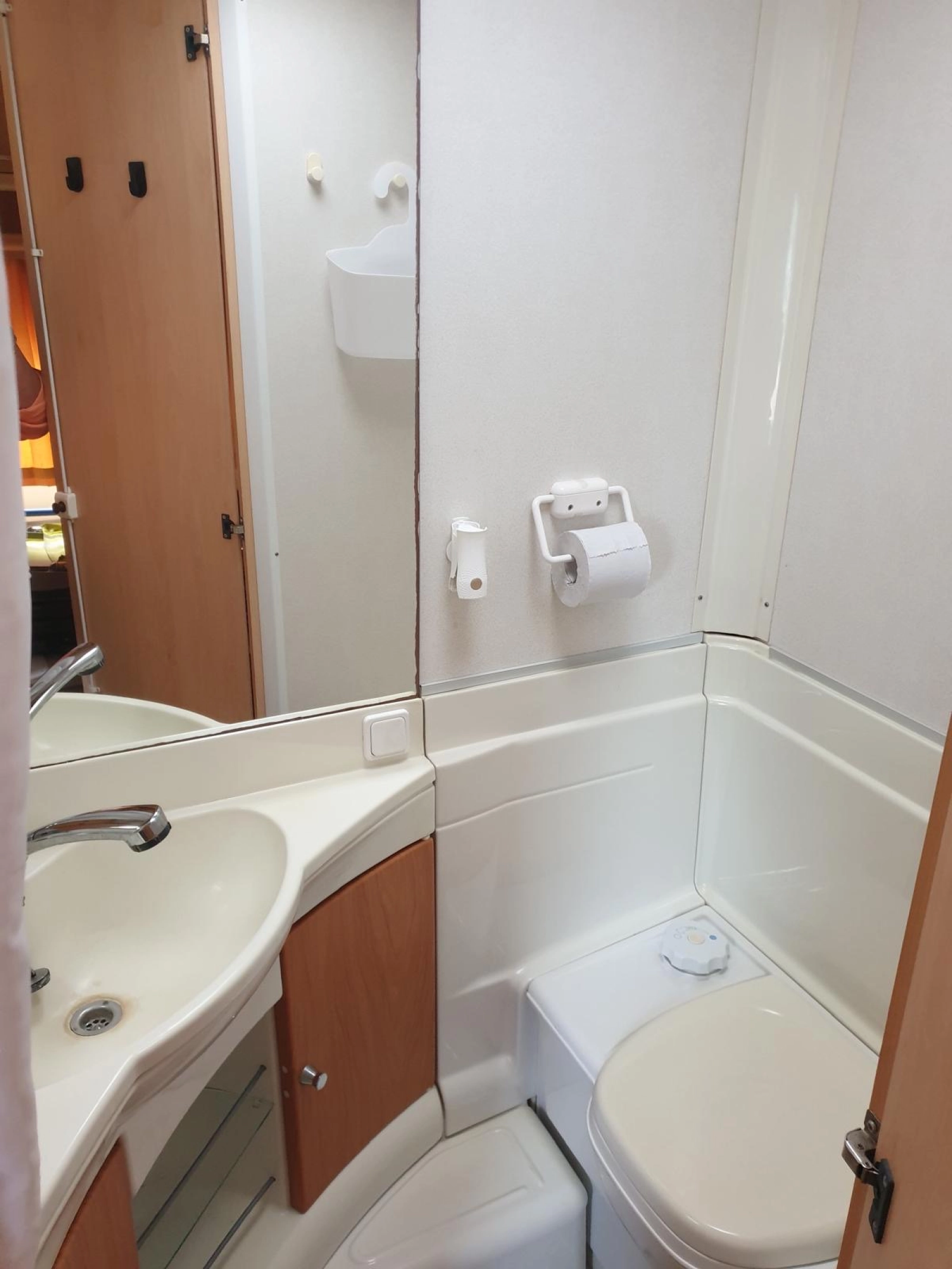 Łazienka ze zintegrowaną toaletą chemiczną.