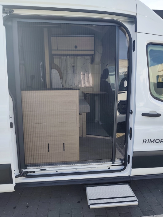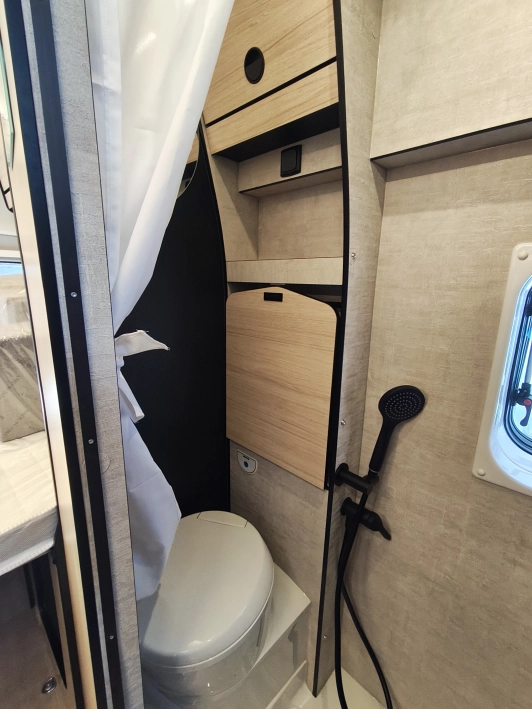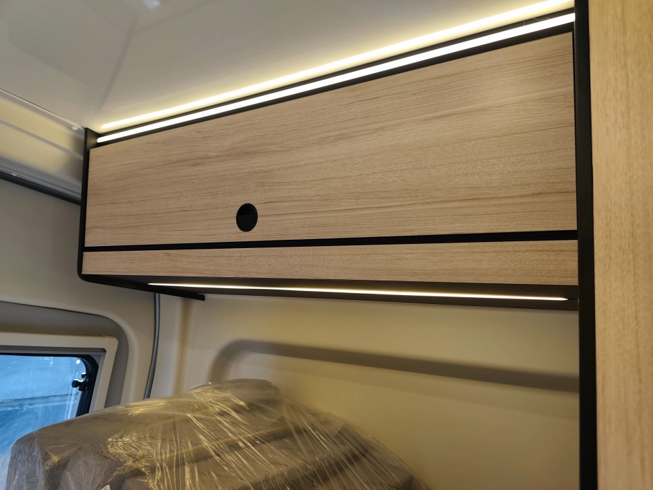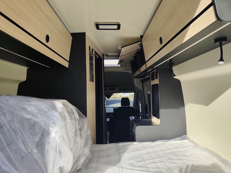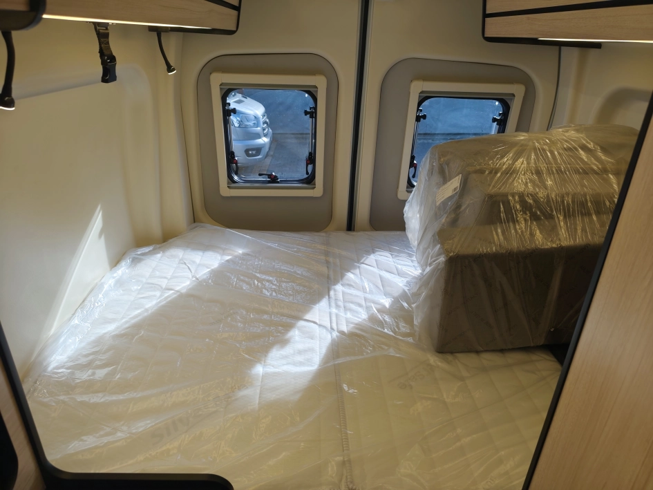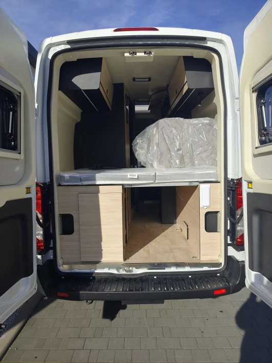 W tylnej części kampera znajduje się podwójne łóżko poprzeczne, co oznacza, że szerokość pojazdu wykorzystana jest na ułożenie łóżka – co sprzyja komfortowi i wygodzie.