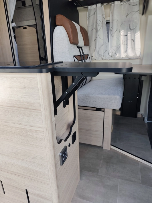 Miejsca siedzące – dwu osobowa kanapa przy stole oraz obrotowe fotele w kabinie kierowcy, co pozwala włączyć je w przestrzeń dzienną po zatrzymaniu.