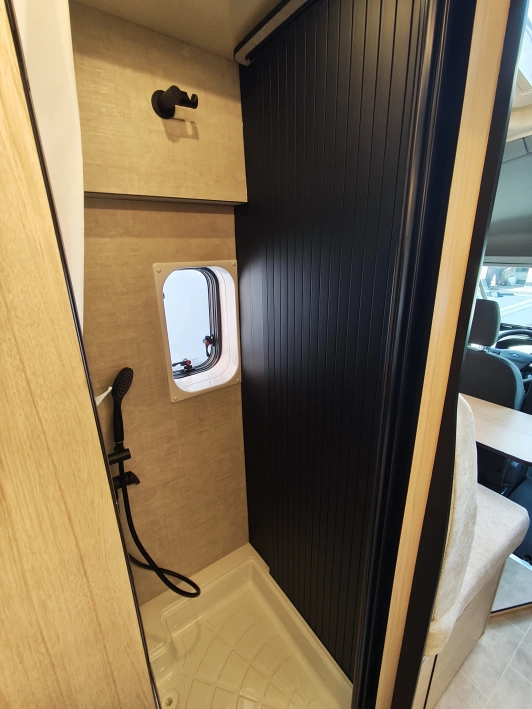 Model oferuje łazienkę wraz z prysznicem, oknem oraz wentylacją