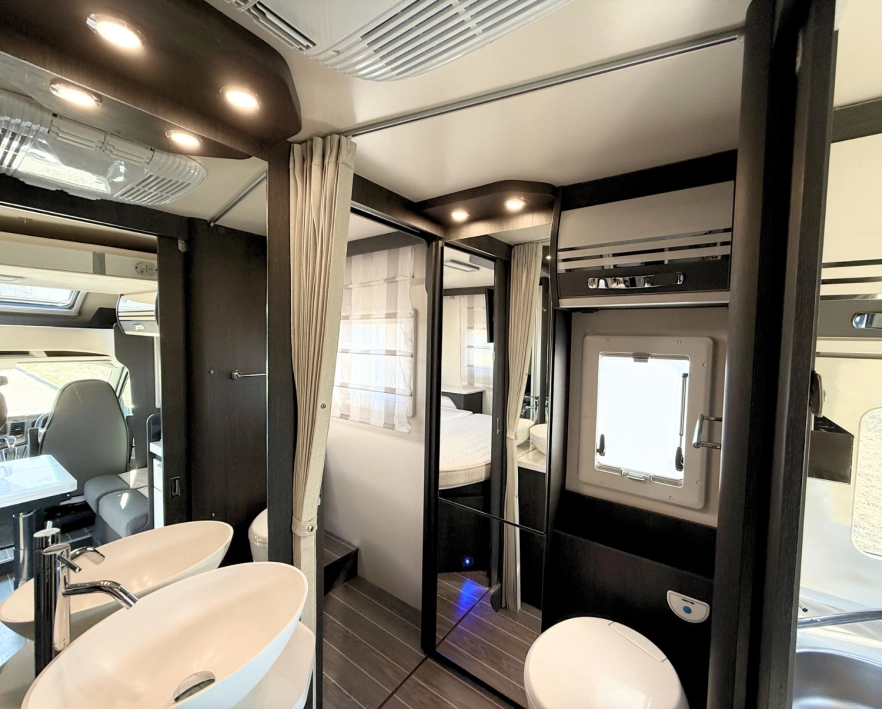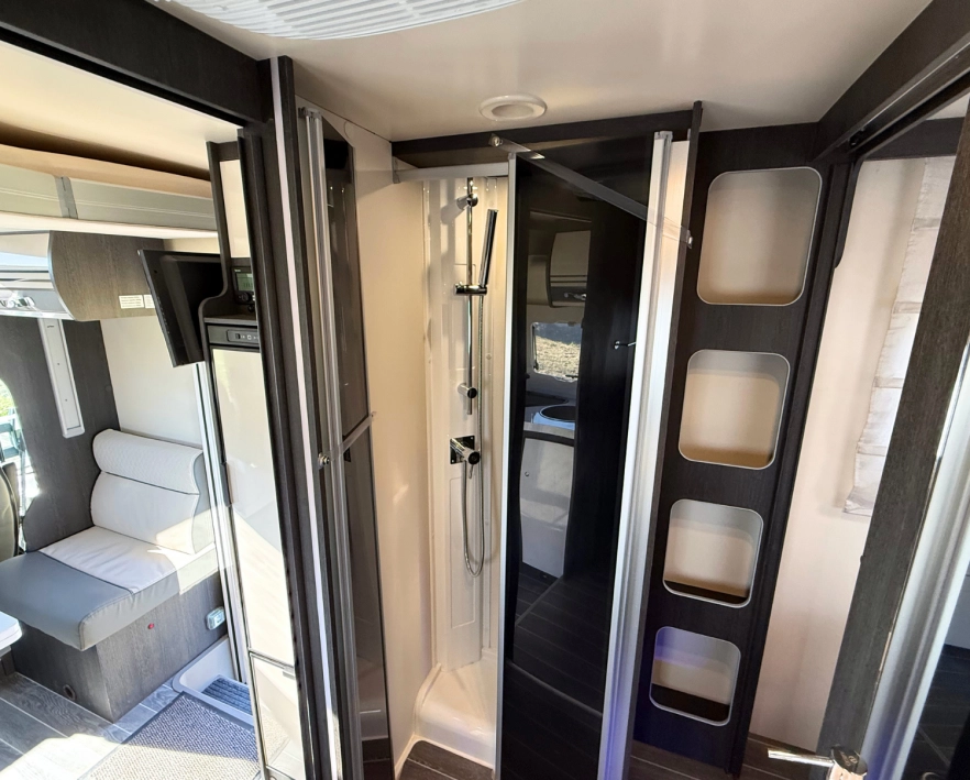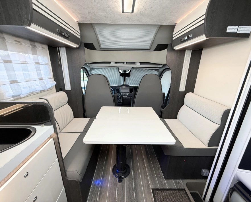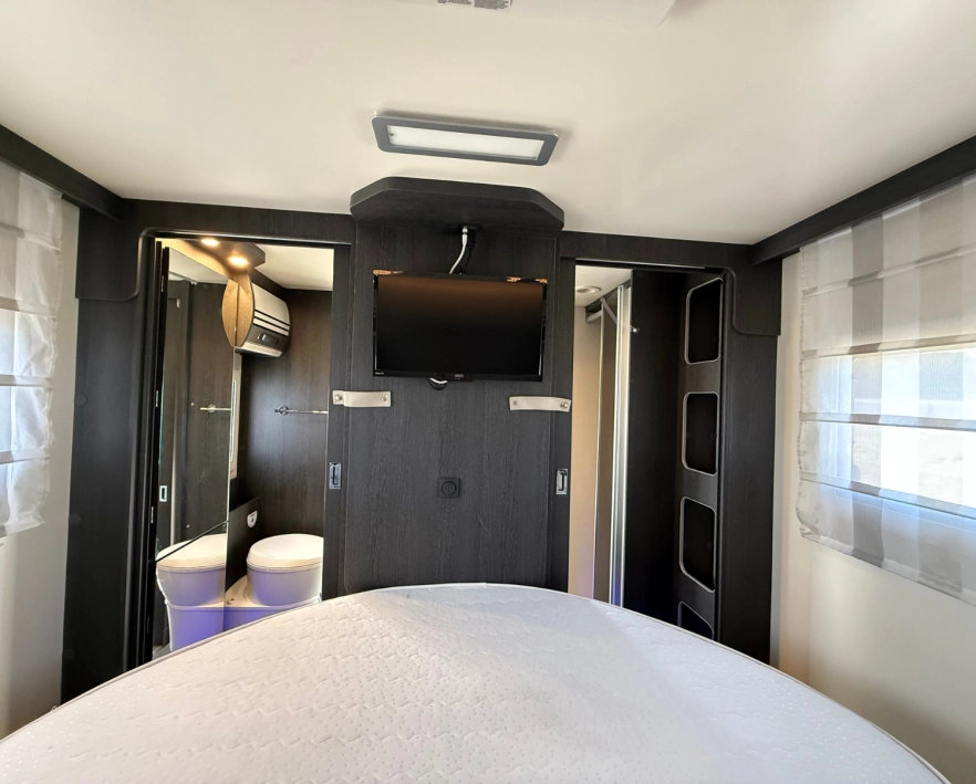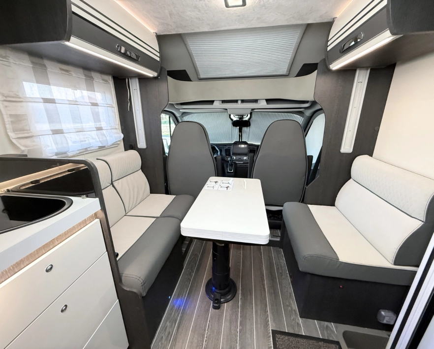 To komfortowy, 4-osobowy kamper z automatyczną skrzynią biegów, wyposażony w markizę, panel solarny, kamerę cofania, klimatyzację postojową i TV – wszystko, czego potrzeba do podróży.