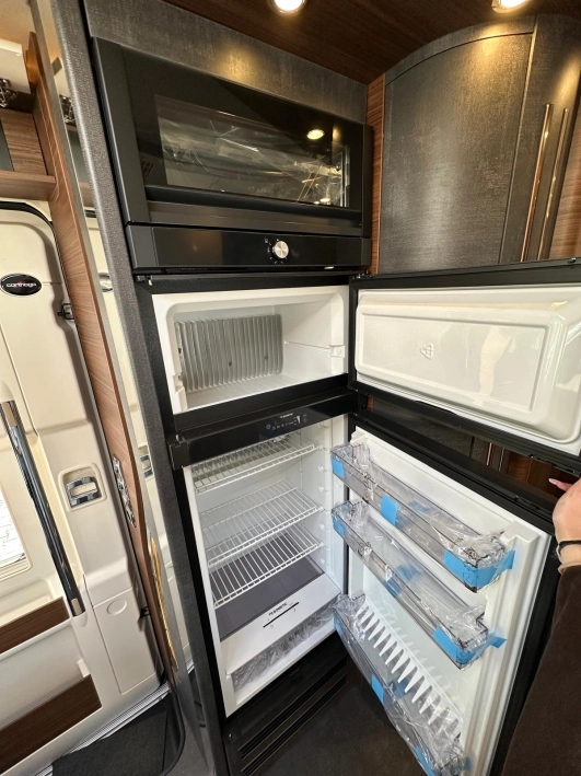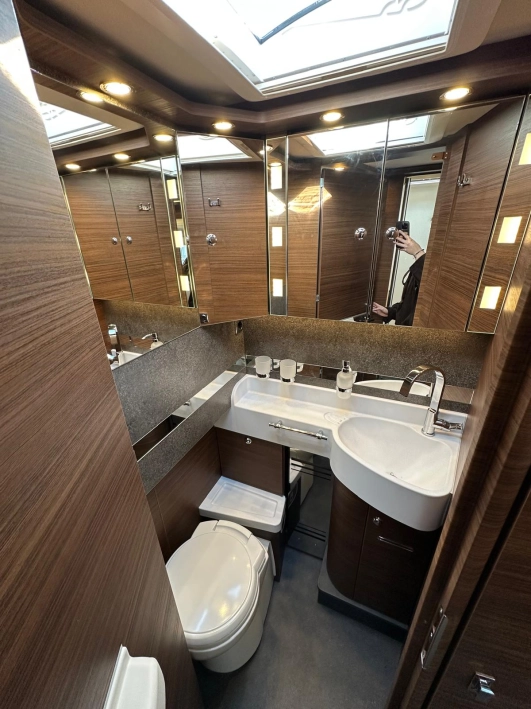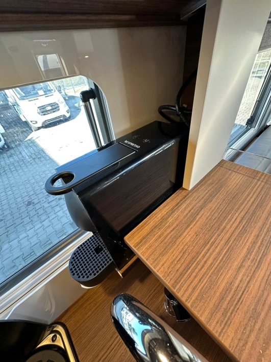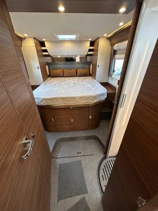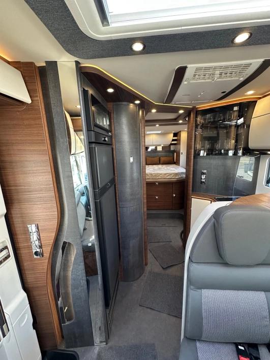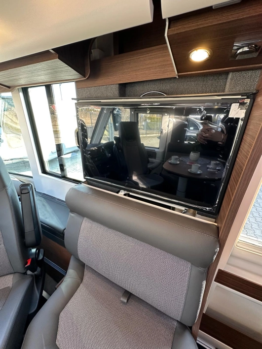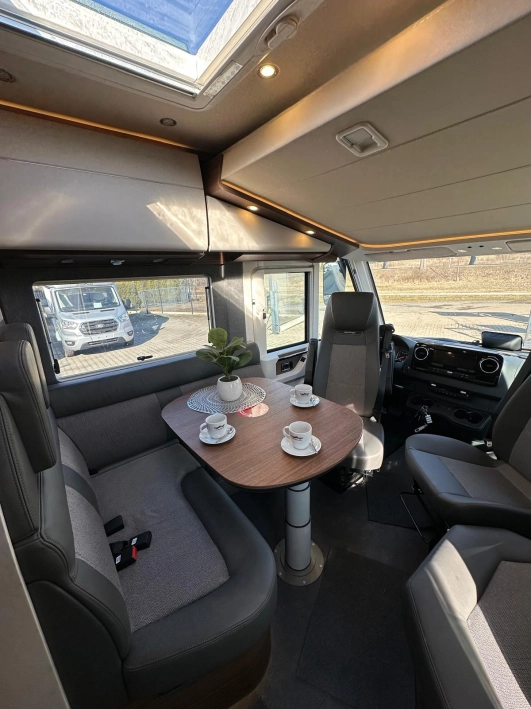 Kamper w wersji SILVERLINE wyróżnia się wyjątkowym, nowoczesnym wykończeniem zewnętrznym i wysokim standardem luksusowym, łącząc elegancję modeli klasy premium z kompaktowym nadwoziem typu integra. Kolorystyka SILVERLINE obejmuje przednią maskę i kabinę w całości w kolorze srebrnym, natomiast dach wykonany jest z białego tworzywa wzmacnianego włóknem szklanym, co poprawia izolację termiczną i chroni wnętrze przed nadmiernym nagrzewaniem.
