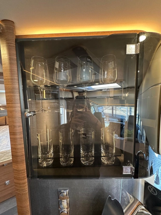 Designerska szafka barowa z uchwytem na szklanki i zestawem szklanek nad kuchnią