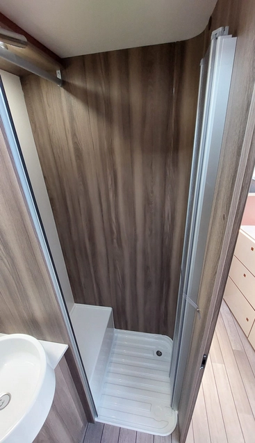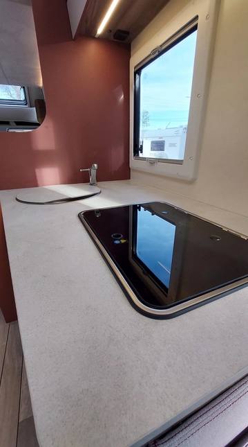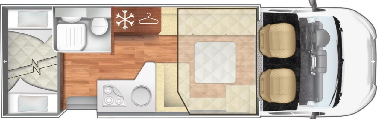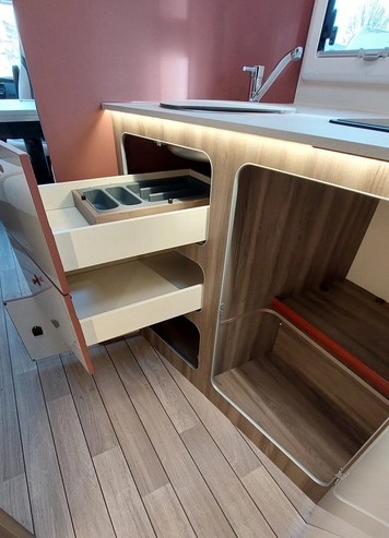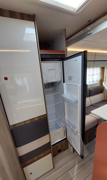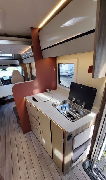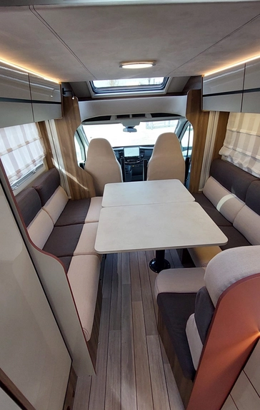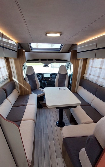 W środku znajdziemy jasne, nowoczesne wnętrze z dużym salonem, w pełni wyposażoną kuchnią, łazienką z osobnym prysznicem oraz wygodnymi łóżkami. Ergonomiczny układ zapewnia swobodę i komfort zarówno w trakcie jazdy, jak i postoju.