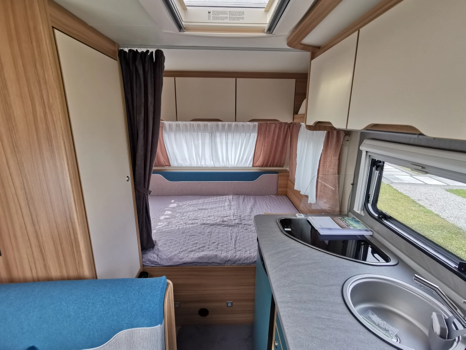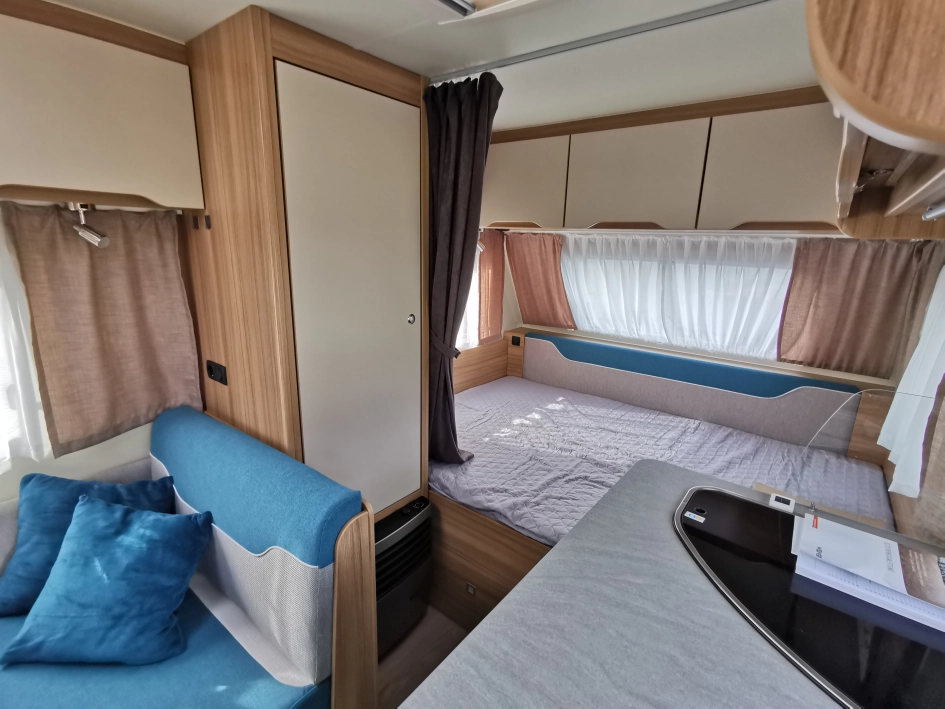 W przedniej części znajduje się łóżko małżeńskie, pod nim duży bagażnik, po środku kuchnia, szafa. Z tyłu część wypoczynkowa z dwoma siedziskami i stolikiem, które można przekształcić w jednoosobowe łózko do spania, oraz łazienka.